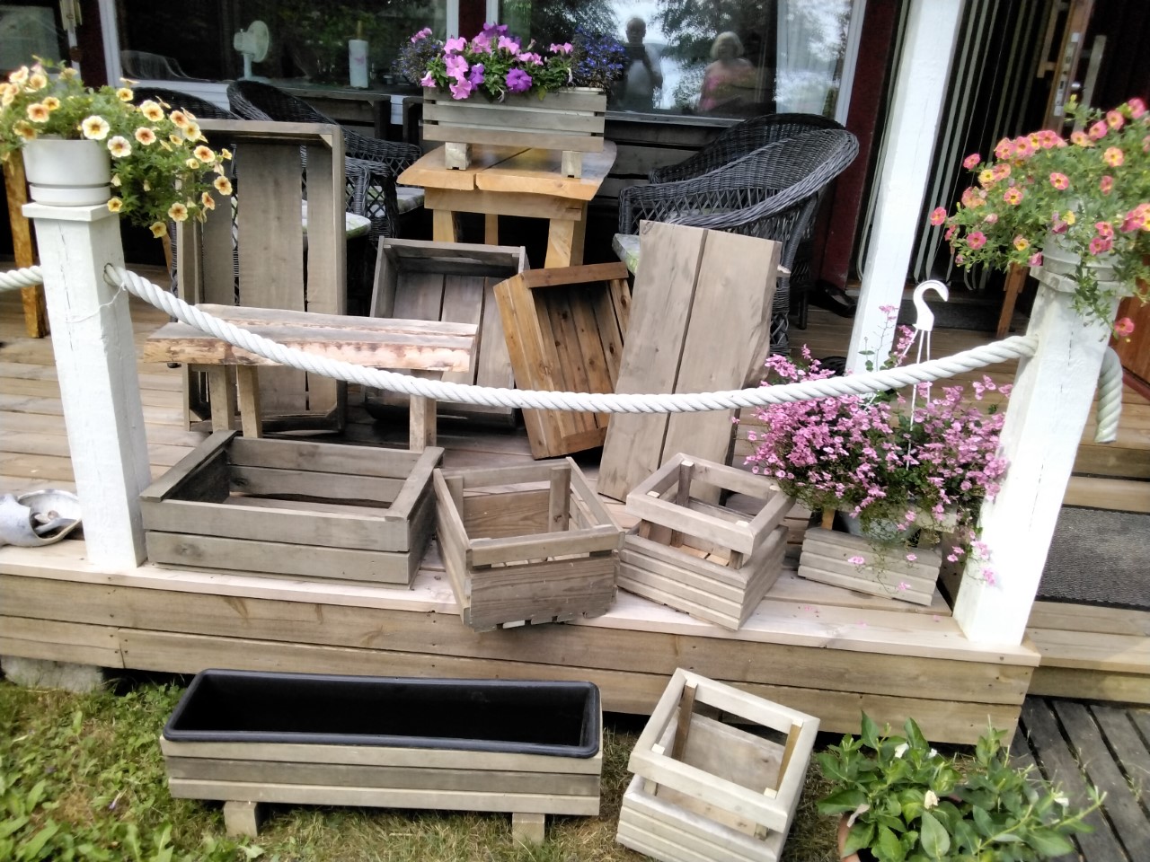 Ruskeat ja harmaat (sixpack, mäyräkoira ) on tehty painekyllästetystä puusta, isommat lootat käsittelemättömästä puusta ja käsitelty terassiöljyllä.
