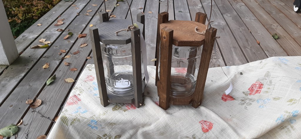 Lyhdyt on valmistettu kierrätyslasipurkeista. Lyhty sisältää ledkynttilän.